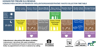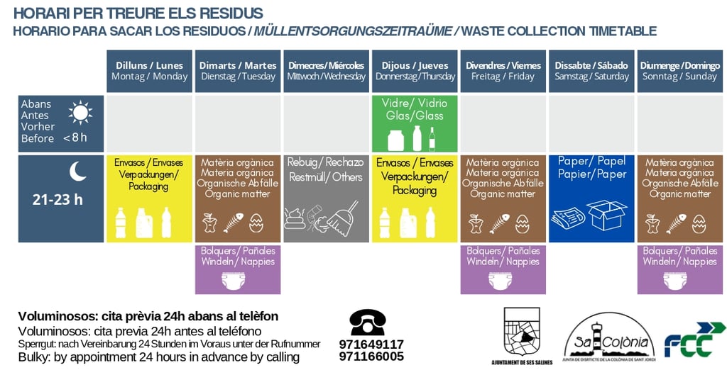 In Colonia de Sant Jordi, selective waste collection is carried out. Please leave the garbage outside the house according to the following schedule: